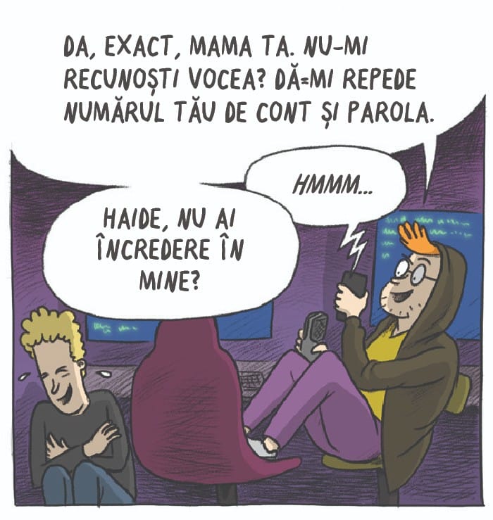 NU LĂSA APELANȚII SĂ TE PRESEZE. ATACATORII CIBERNETICI INVENTEAZĂ POVEȘTI EMOȚIONALE PENTRU A TE FACE SĂ REACȚIONEZI RAPID. IA-ȚI TIMP SĂ VERIFICI SITUAȚIA ȘI, DACĂ AI DUBII, VORBEȘTE CU ALȚI MEMBRI AI FAMILIEI ÎNAINTE SĂ REACȚIONEZI.
