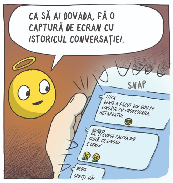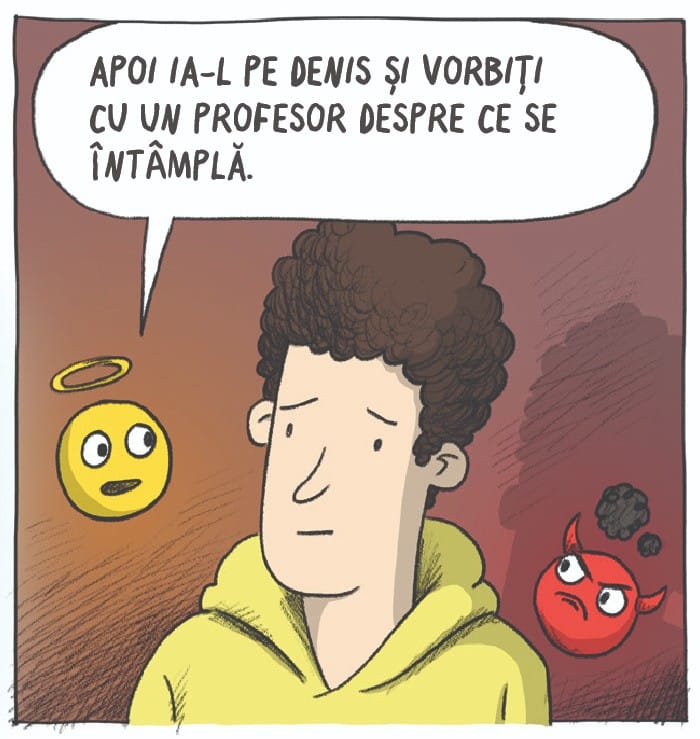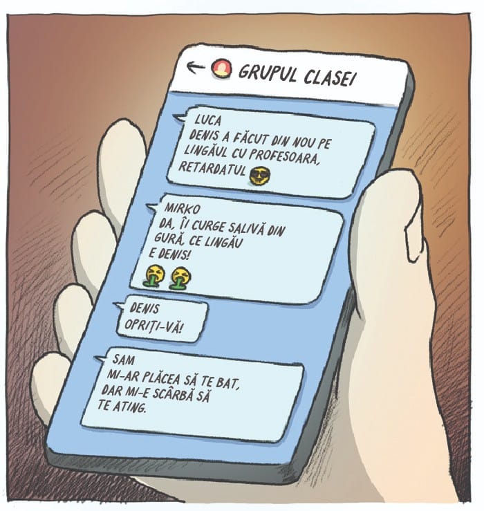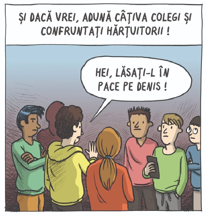 CHIAR DACĂ E DIFICIL, IA POZIȚIE FAȚĂ DE BULLYING. COMBATE-L, DAR NU SINGUR. GĂSEȘTE UN GRUP DE OAMENI CARE O PLAC PE PERSOANA AGRESATĂ ȘI SUNT DISPUȘI SĂ O APERE. ÎMPREUNĂ PUTEȚI COMBATE BULLYING-UL. PERSOANA ÎN CAUZĂ POATE SOLICITA AJUTOR LA NUMĂRUL DE TELEFON 119.